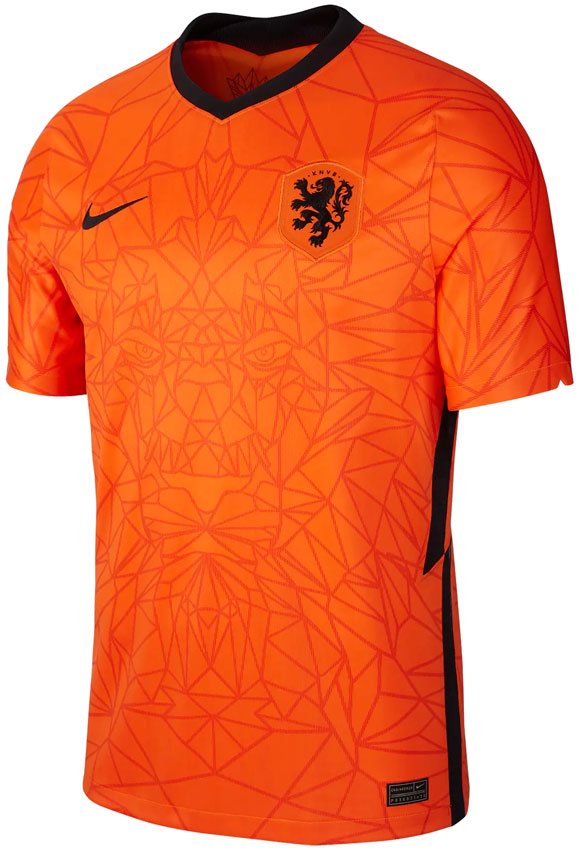 中央に細いライングラフィックで、オランダ国章やチームエンブレムに登場するライオンの顔を描く。KappaやPumaではなく、Nikeでこのようなデザインは珍しい。