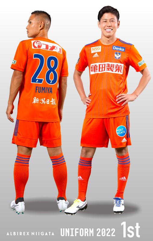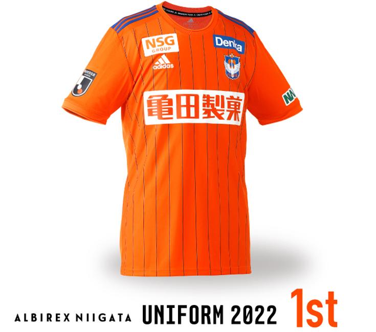 今年もJ最速でのデザイン発表を実施した新潟。2022シーズンの新ホームユニフォーム・デザインは、オレンジを基調にブルーのピンストライプに決定した。