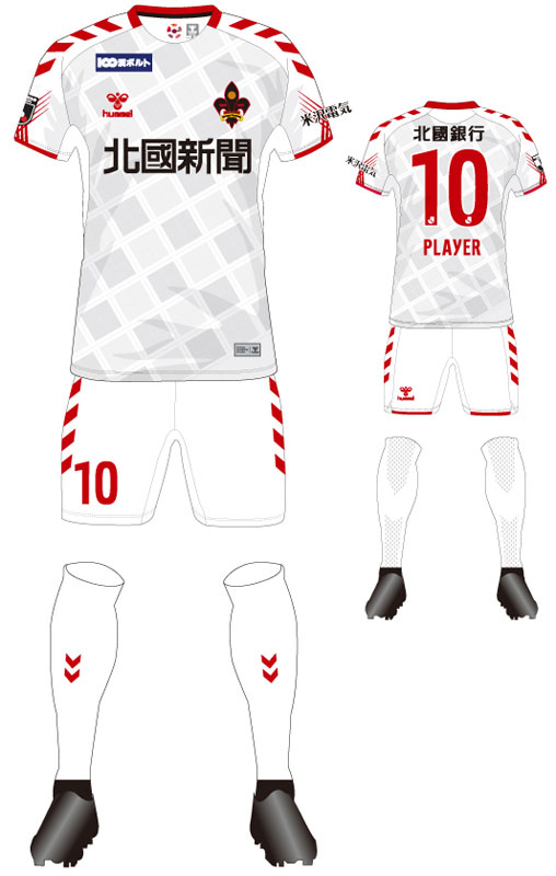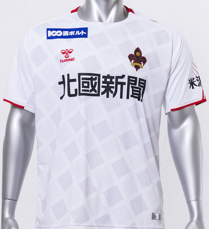 新アウェイユニフォームもホームと同様に「鼓門の格子柄」をモチーフとしたデザイン。色は雪国・金沢を思わせるホワイトを基調とする。