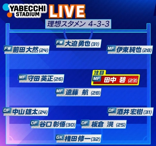中盤の3枚は安定してるので変わらずですね。前線は右から伊東純也、大迫勇也、前田大然の3人を並べてみました。