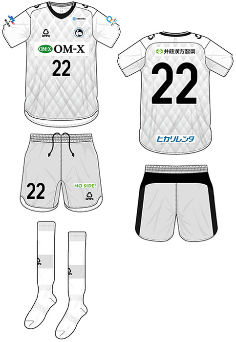 各部スポンサーは、胸に「OM-X(バイオバンク)」、背中上に「井藤漢方製薬」、背中下に「ヒカリレンタ」、鎖骨左に「REMATEC」、左袖に「ReCORE鍼灸接骨院」、パンツに「NO SIDE!」。