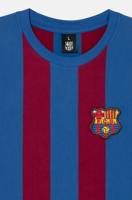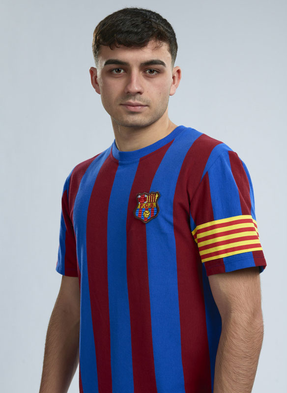クラシックな細めのストライプで、袖にキャプテンマークをデザインしたレトロジャージ。クライフ、バケーロ、グアルディオラ、プジョル、チャビ、イニエスタ、メッシなど歴代カピタン(キャプテン)に敬意を表している。