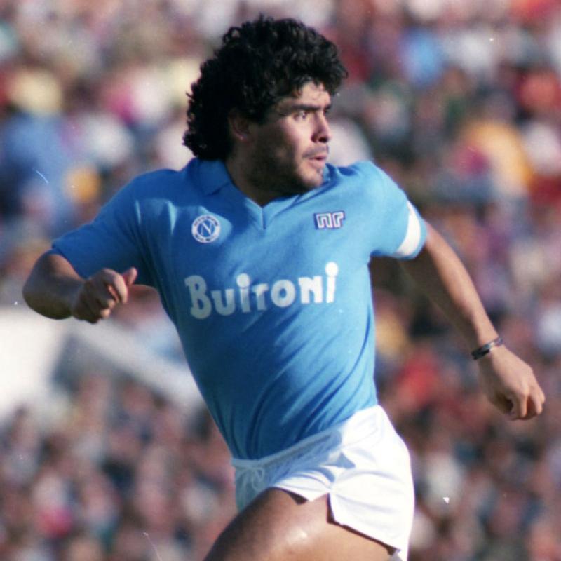 バルセロナを退団し、84年にナポリへ移籍。当時のユニフォームは「Buitoni」のロゴが印象的である。この大きめの襟とVネックのキットはセリエAとUEFAカップで使用。そしてクラブのセリエA初優勝ユニとなった。なお、襟周りのデザインが異なる別バージョンも存在する。