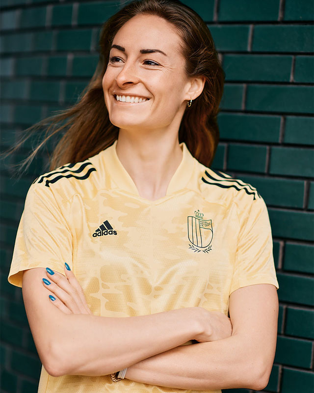 新アウェイユニフォームはゴールド(RBFAは黄土色と説明)を基調とし、独特のユニークなグラフィックが目を引くデザイン。こちらも初の女子代表オリジナルとなる。