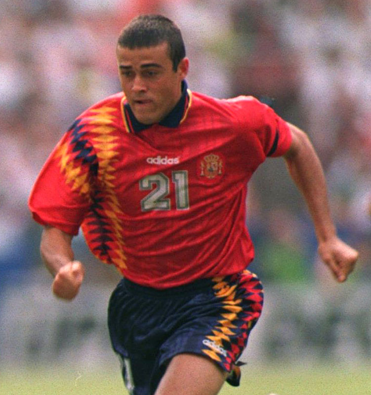 右半身に走らせるダイヤモンド柄のストライプは94年大会の象徴的なデザイン。スペインはパンツにもストライプをあしらい、アシンメトリーに仕上げていた。