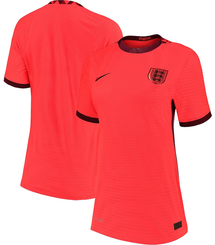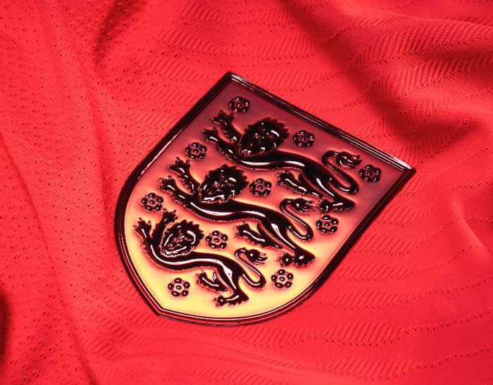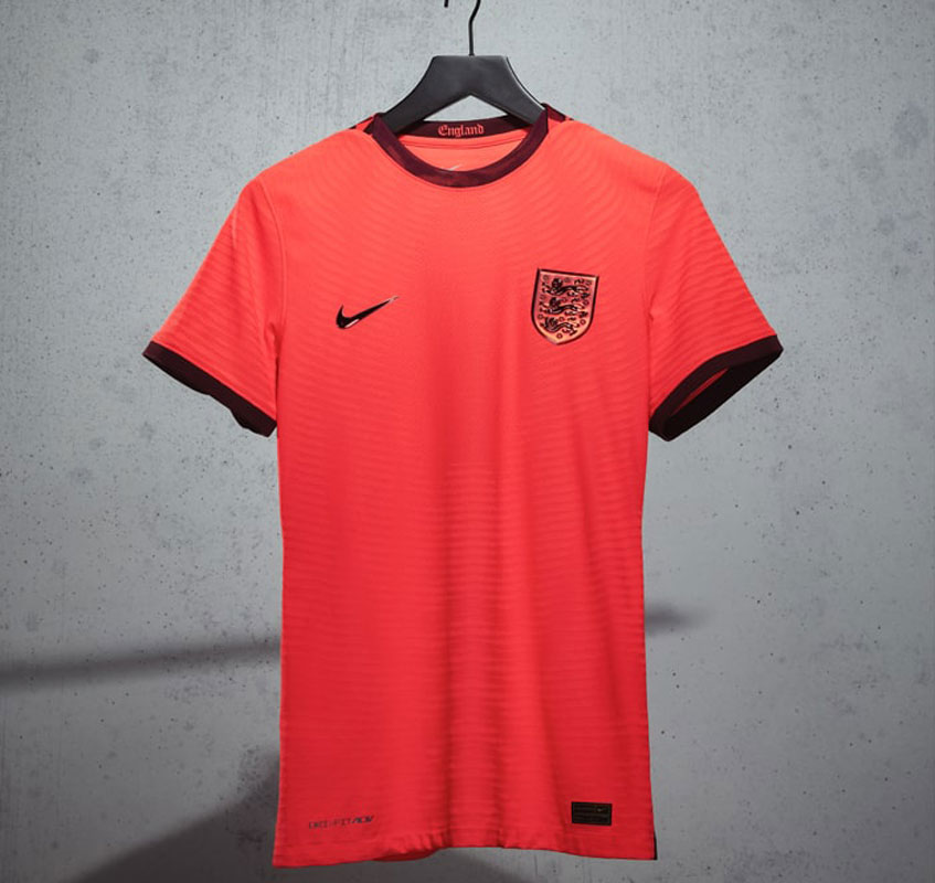 新アウェイユニフォームはオレンジに見えるカラーを採用。Nikeの色名は“ブライトクリムゾン”で、一応はレッド系のカラーとなる。イングランドのアウェイといえば伝統的に一目でレッドと分かる色が多く、今回のようなキットカラーは珍しい。