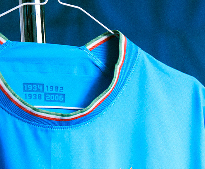 イタリアのW杯優勝は1934年イタリア大会、1938年フランス大会、1982年イタリア大会、2006年ドイツ大会の4回。2つのブルーで構成するクォータリーデザインは、何世代にもわたるアズーリの成功を祝したものだ。