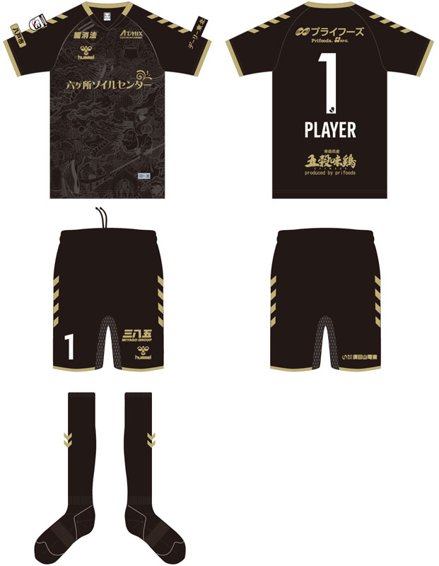 GKユニフォームはブラックを基調に、フィールドプレーヤーと同じく「義経北行伝説」を描いたデザイン。