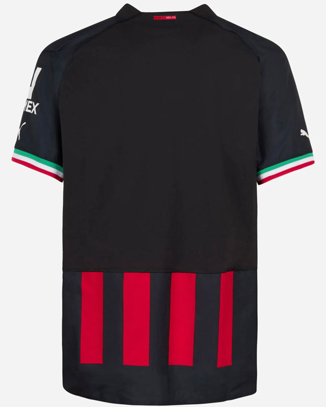 22-23新ホームユニフォームは全体的にはブラックを基調とし、シャツの中心にブラックを据えた伝統的なロッソネロ(赤と黒)のストライプをあしらったデザイン。上下のストライプが途中で止まるのは、22-23シーズンのPumaの特徴となっている。