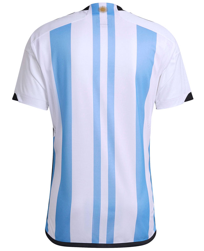 背面の細いストライプは、ちょっとしたユニークな試み。上に延びる2本のスカイブルーのストライプは、首元で国の象徴「5月の太陽」を挟む形になる。ストライプに縦横の違いはあるが、どことなくアルゼンチン国旗を思わせる仕掛けだ。