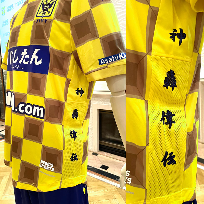 22-23新ユニフォームのデザインは『和の市松柄』。勝利を象徴するチェッカーフラッグの柄であり、和を連想させる市松柄を グラフィック表現した。脇には『神轟偉伝』の4文字を大胆に配置。これは“神にも轟く偉人達の伝説”という意味で、シント=トロイデンの当て字でもある。