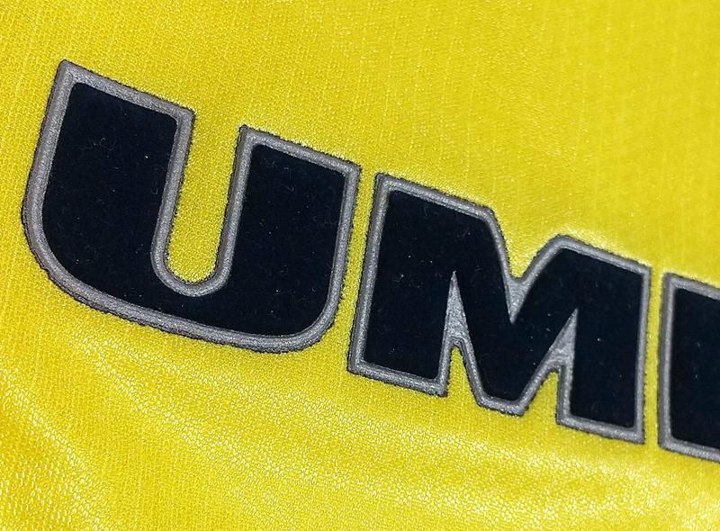 レプリカは大きなダブルダイヤモンド(Umbroロゴ)ですが、選手用キットは小さいダブルダイヤモンドと「UMBRO」の横一列表示です。これは当時Umbroと契約していた他のチームのキットにも見られました。