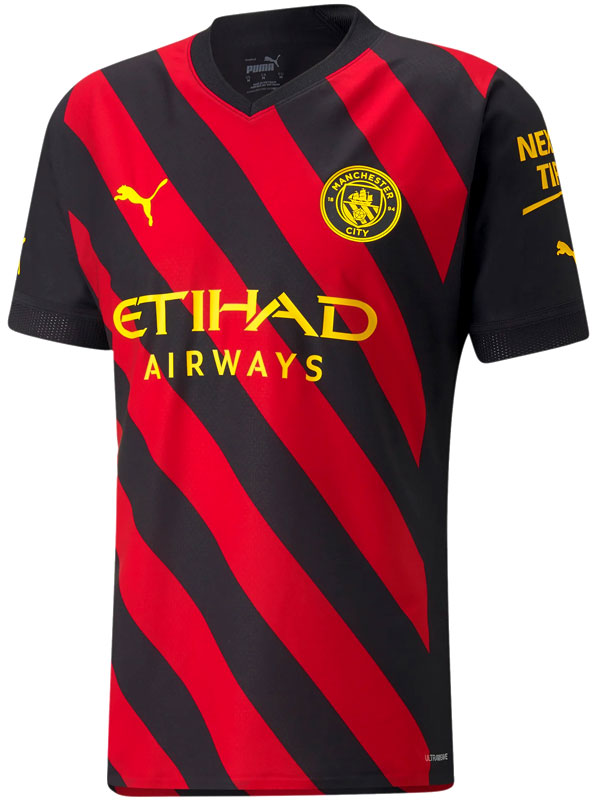 これまでレッド&ブラックの斜めストライプを「たすき掛け」にしたことはあっても、シャツ全体に配したスタイルは過去に例がない。斜めストライプはエンブレムにデザインされているもので、これはマンチェスター市を流れる3つの川(アーウェル川、メドロック川、アーク川)を表している。