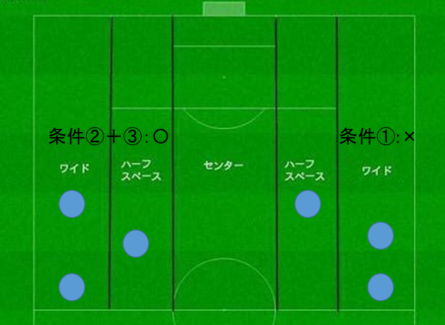ピッチを縦に5分割し、それぞれのレーンを【中央】【左右ワイド】【左右インサイド(ハーフスペース】と形容する。そのうえで、「5レーン理論」は、次の3つの条件によって「トライアングルを的確に作るための考え方」と説かれる。