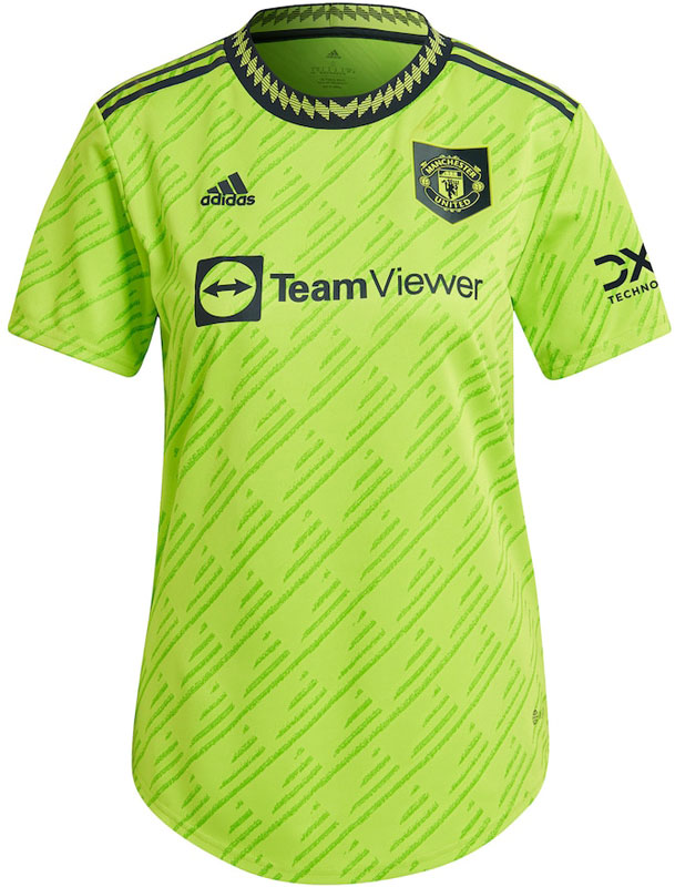 22-23新サードユニフォームは、ユナイテッドでは非常に珍しいグリーンを基調色に採用。シャツ全体に斜め模様のグラフィックを落とし込んだ幾何学模様的デザインが登場した。