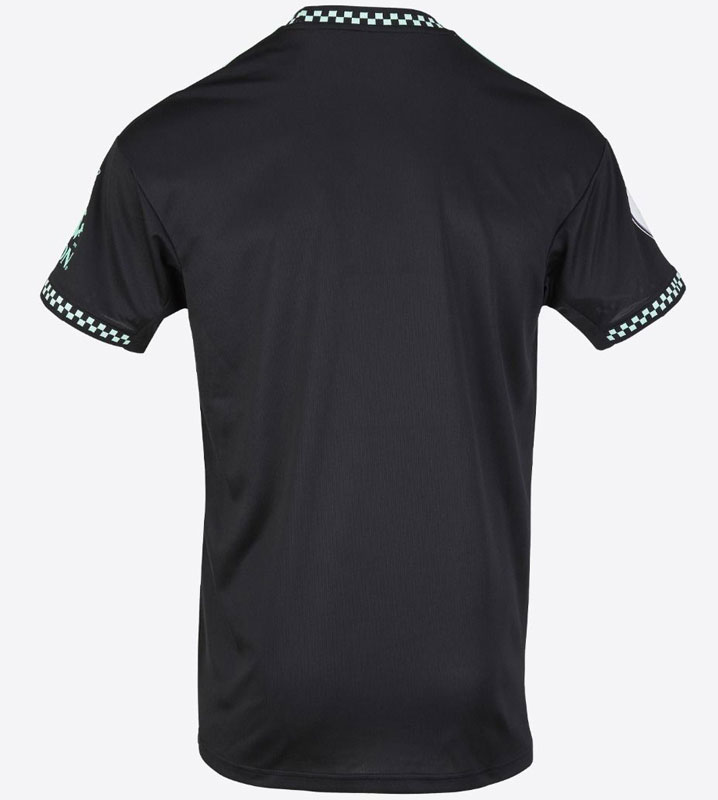 22-23新アウェイユニフォームは、ブラックを基調にミントという色の組み合わせ。エンブレム、袖のスリーストライプス、胸スポンサーなど各部はすべてミントで彩る。首周りと袖口に配したチェックパターンも目を引くデザインだ。