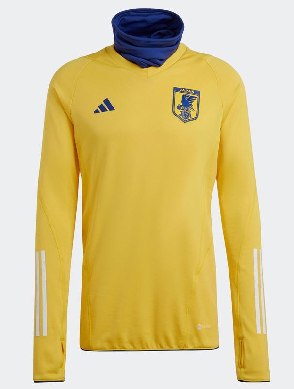 選手がトレーニング時に着用する長袖トレーニングウェア。イエロー(ゴールド)を基調とした大胆な色使いで、エンブレムも斬新なカラーを採用。寒さをブロックするハイネック仕様。袖口には親指を通すサムホール付き。