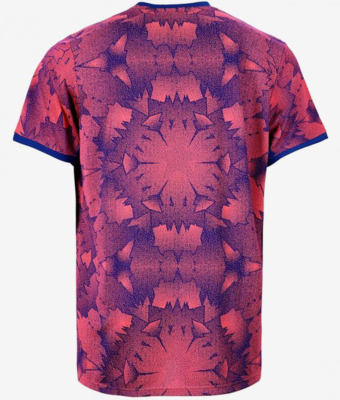 22-23新サードユニフォームは、チームの初代キットカラーであり現在でも定番のピンクを基調とし、首周りや袖口にブルーの差し色を配する。シャツ全面に華やかな模様を描いたデザインが印象的な一着だ。