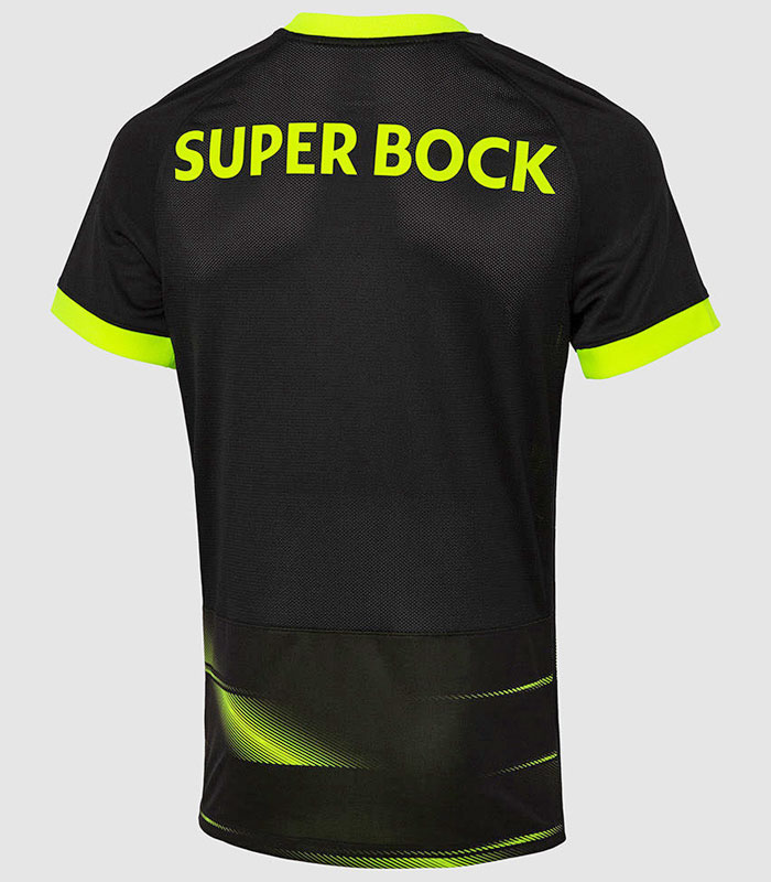 22-23新アウェイユニフォームは、ブラックを基調に蛍光色のヴォルトグリーンを組み合せたデザイン。エンブレム、スポンサーロゴ、段違い的に配した斜めグラフィックなどは全てヴォルトグリーンで彩り、かなり鮮烈な印象を与える。