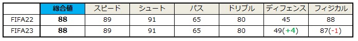 総合値を含めて、スピード、シュート、パスの値は変わらず。守備は上がったものの、フィジカルは逆に1ポイントダウン。スタミナが82から81に下がっているが、それ以外は変化はなさそうだ。