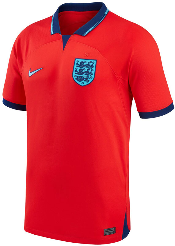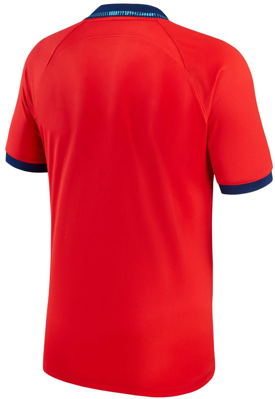 2022新アウェイユニフォームは一瞬で懐かしさを覚えるクラシックなデザインが登場。定番のレッドを基調に、襟と袖口にネイビーを配するスタイルは、2000年の欧州選手権(EURO2000)や2002日韓W杯・欧州予選で使用した1999-2001アウェイユニフォームを思わせる。