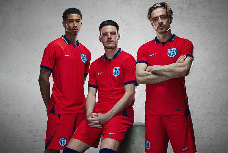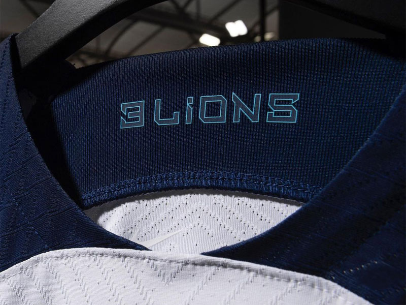 新ユニフォームはそれぞれチームの愛称“3 Lions”(スリーライオンズ)をレタリング。ホームキットは首元の内側にプリントし、アウェイキットはネイビーの襟をめくると文字が出てくる仕掛け。使われているフォントは、英国のヘヴィメタルバンドが使うインダストリアルフォントに触発されたものだという。