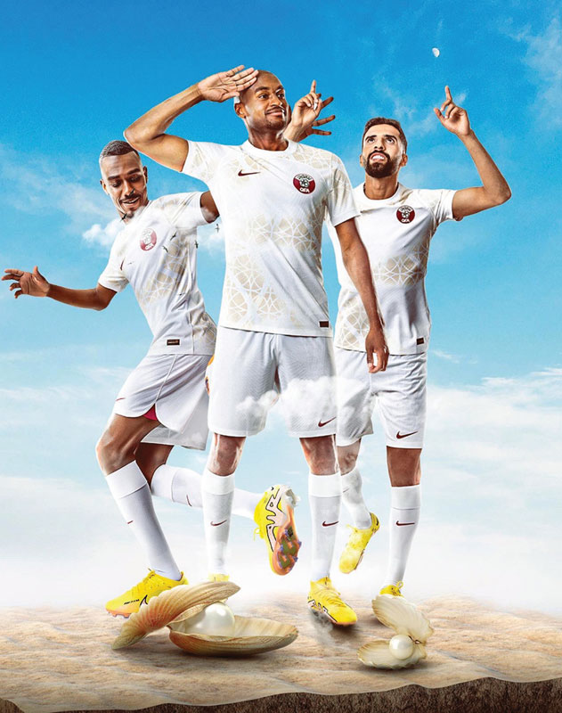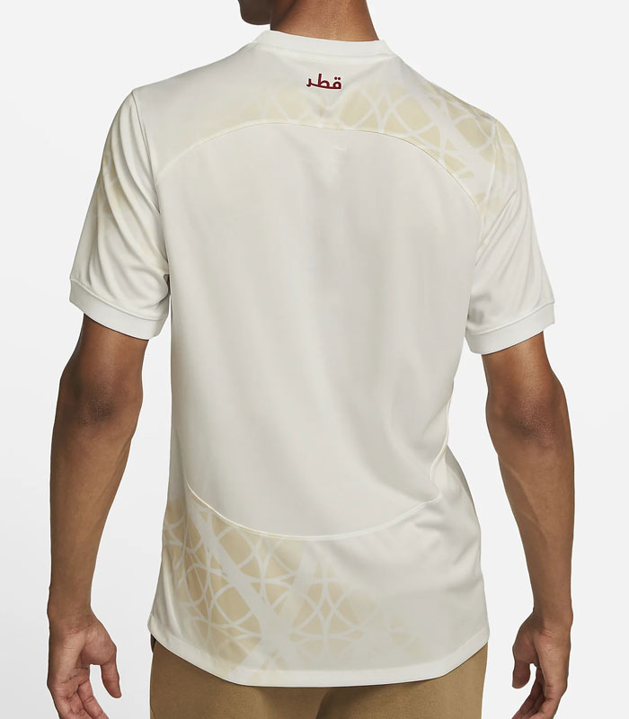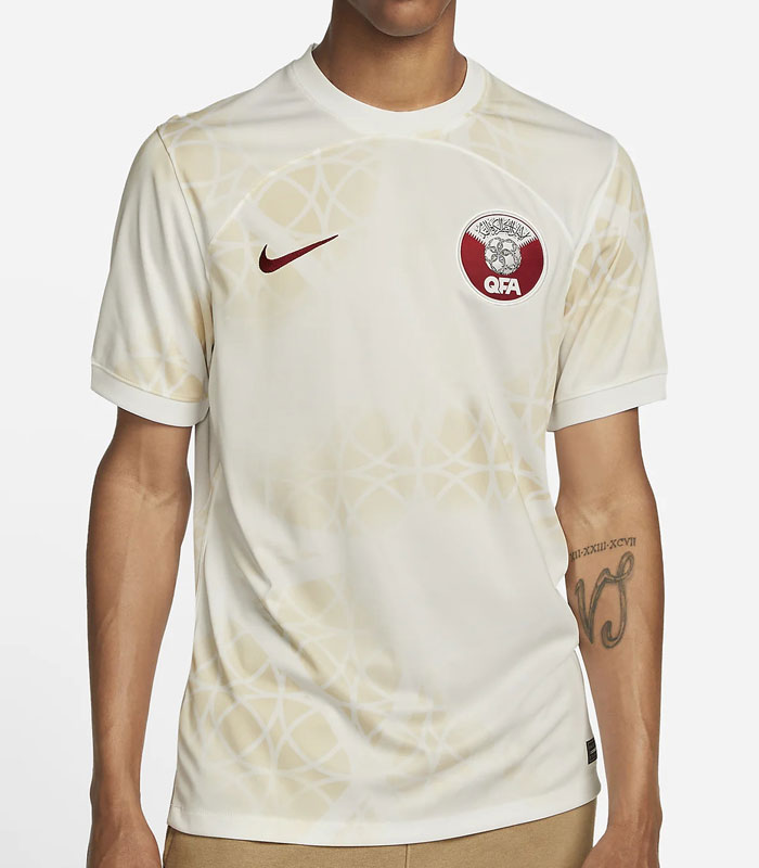 2022新アウェイユニフォームは、こちらも定番カラーのホワイトを基調としたデザイン。グラフィックはカタールの美しい海岸線をイメージし、かつて国を支えた真珠産業に敬意を表したものとなっている。