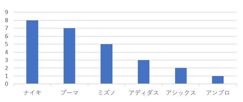 2位には前回から大きく選手を増やしたプーマが入った。こちらは中盤の大黒柱である遠藤航、攻撃のカギを握るサイドアタッカーの伊東純也や三笘薫などが履いている。