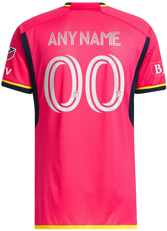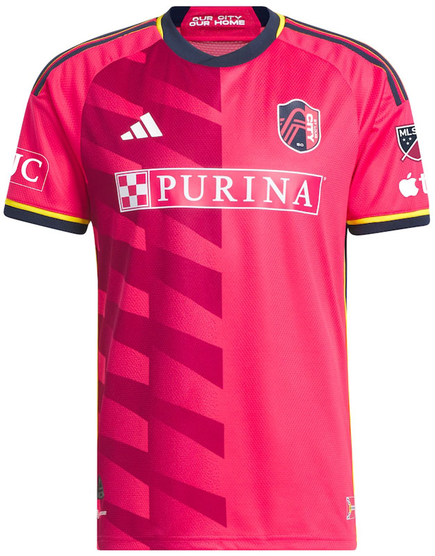 記念すべき2023-24新ホームユニフォームは、セントルイスの街の色でもあるレッド(City Red)を基調に、ネイビーとイエローでアクセントを加えたデザイン。ピンクにも見える色だがクラブの説明ではレッドだという。