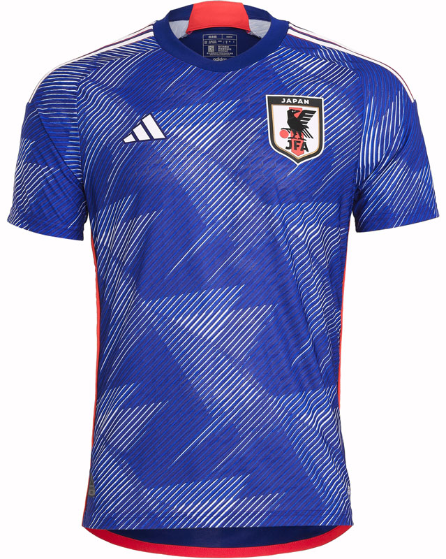 世界各国で評判の良いSAMURAI BLUEのユニフォーム。ひとつ壁を乗り越えたと感じるデザインは、2002年日韓W杯・決勝戦後に舞った折り紙の鶴が原点で、“ORIGAMI”をテーマにしたグラフィックを鮮やかに鋭く描く。あえて言うなら、脇部分のラインはネイビーだとより引き締まった印象だったかもしれない。今回はソックスのデザインも秀逸である。