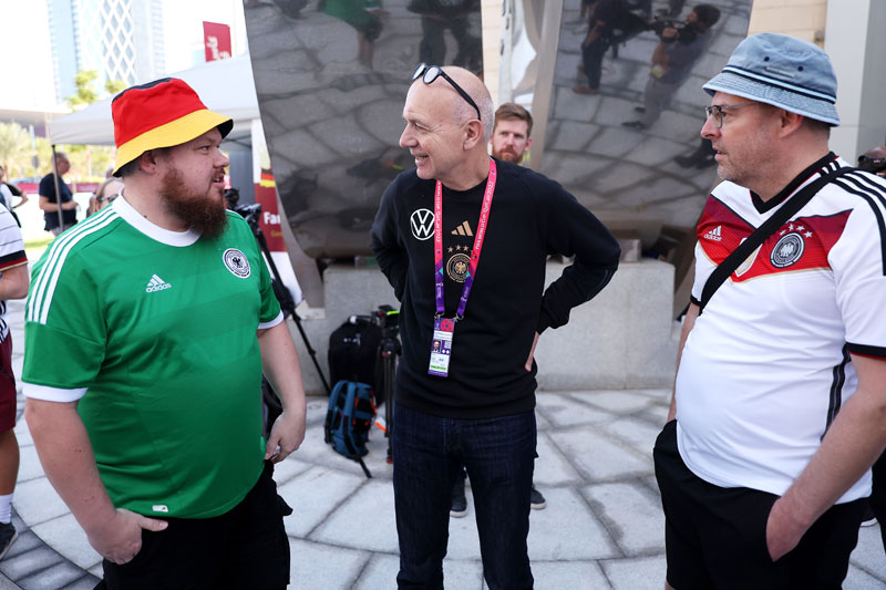 両脇はドイツサポの2人で、右は胸のV字デザインが特徴的な2014ブラジルW杯モデル。左の緑のユニはEURO2012アウェイモデルだ。なお、中央の黒服姿の男性はサポーターではなく、じつはドイツサッカー連盟(DFB)の会長さん。