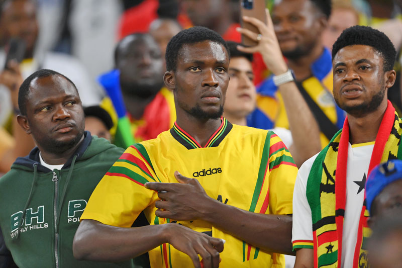 アフリカ大陸各国のサポーターも熱い。このガーナサポが着ているのは、袖の3本線に特徴がある1996モデル。たぶん胸の黒い星の下にGHANAと国名をプリントしているバージョンだが、国旗色でもあるラスタカラーのデザインがカッコいい。