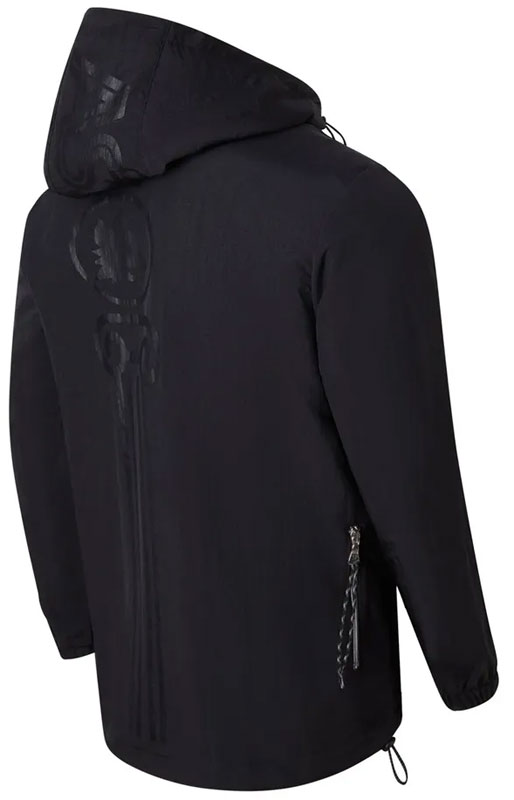 右胸のNBロゴの下にAriesのロゴをダブルネームを配したスペシャルなプレゲームジャケット。ストリートテイストの中であえてブラックカラーで提案した一着。後身頃にはチームの象徴であるオオカミをスタイリッシュに描く。