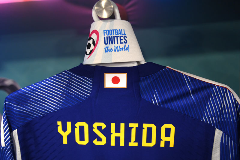 今大会のキャプテンを務める吉田麻也のユニフォーム。ハンガーにはキャプテンアームバンドも。