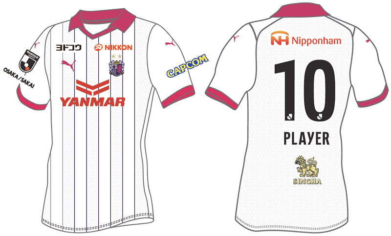 画像の各部スポンサーは、胸に「YANMER(ヤンマー)」、背中上に「Nipponham(日本ハム)」、背中下に「SINGHA(シンハー)」、鎖骨右に「ヨドコウ」、鎖骨左に「NIKKON(ニッコンHD)」、左袖に「CAPCOM(カプコン)」。なお、パンツは現時点で公開されていないためスポンサーロゴについては不明。
