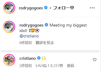 ロドリゴは「一番のアイドルであるロナウドに会えた!」と2ショットをSNSにポスト。