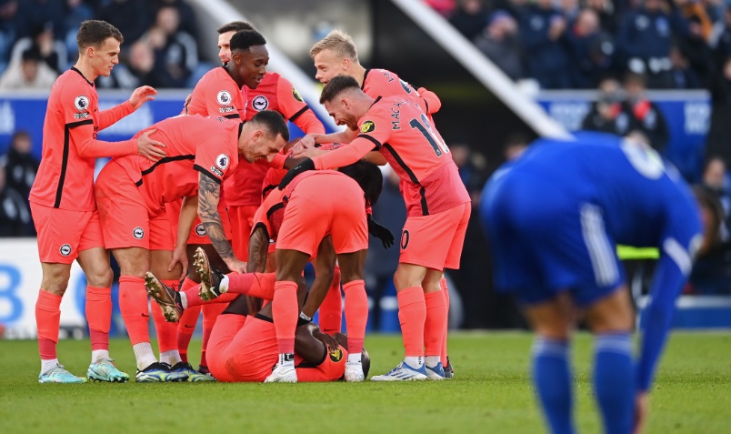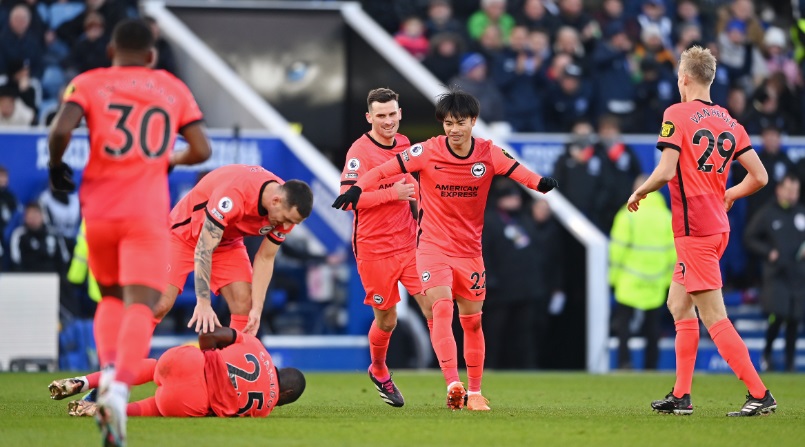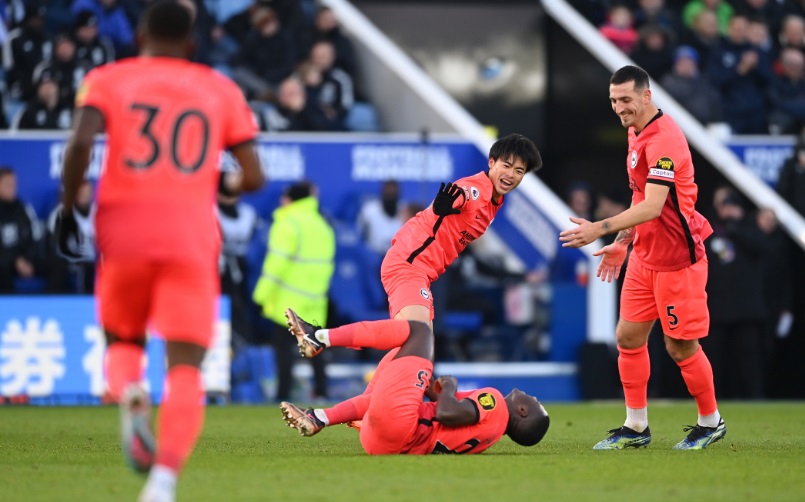 三笘は倒れたカイセドに心配そうに駆け寄るも、周りの選手は思わず笑ってしまっていた。