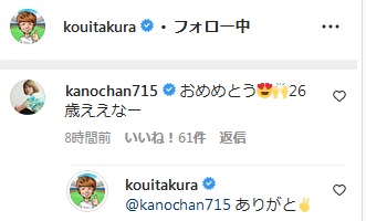 また、元バレーボール選手の狩野舞子さんが「おめめとう 26歳ええなー」とコメントすると、板倉は「ありがと」と返信している。