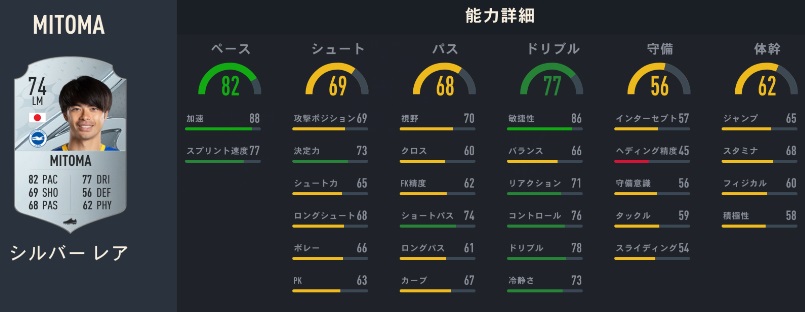 基本的に能力ランクはゴールド、シルバー、ブロンズに分かれているが、総合値74の三笘はシルバー(75以上でゴールド)。
