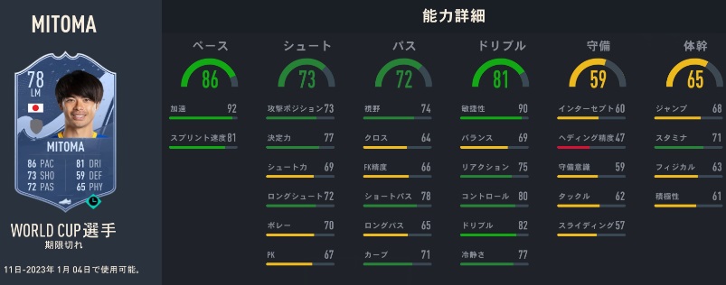 期間限定で使用できたワールドカップバージョンは総合値が78に上がっており、加速と敏捷性は90代だが、ドリブルは82。今後の能力アップに期待したい。