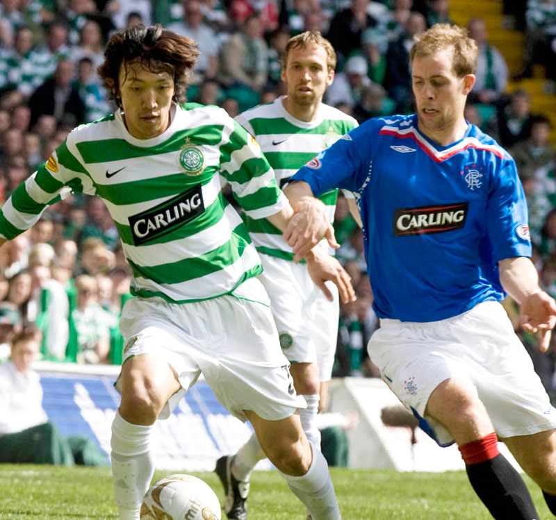 オールドファームと呼ばれるダービーマッチで激しく戦うセルティックとレンジャーズ。両者は2000年代に同じイギリスのメジャーなビールブランド「Carling」のロゴを付けている。