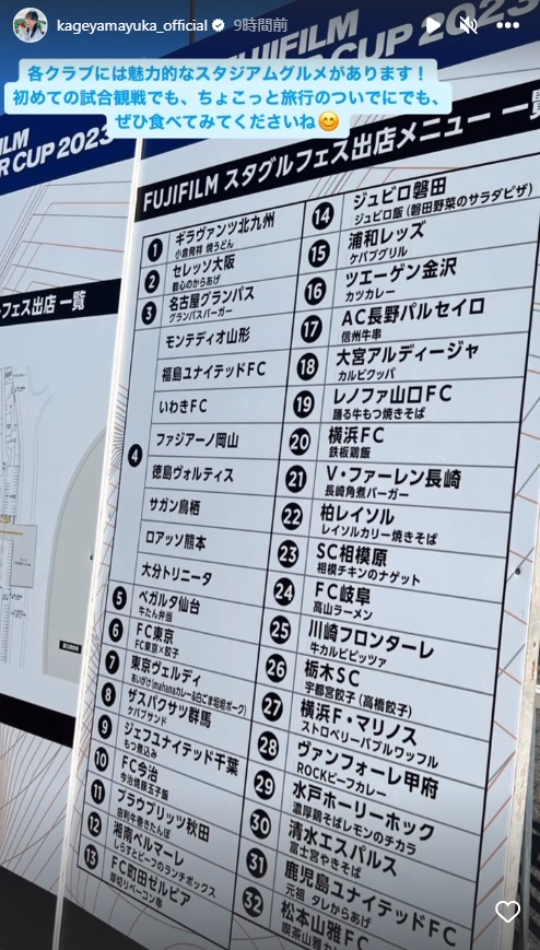 この日はJクラブのスタジアムグルメを販売するイベント「スタグルフェス」が行われたが、影山さんはSNSにこんな投稿をしていたぞ。