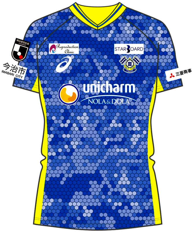 2023シーズンは今治とAsicsが初めてコンビを組んだ2022モデルを継続で使用。デザインはブルーを基調にイエローを取り入れたもので、ドット柄が印象的なこのユニフォームは白濱亜嵐さん(EXILE/GENARATIONS/PKCZ)がプロデュースを担当している。