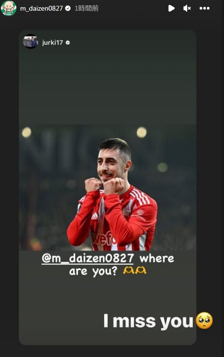 前田も「自分も君が恋しいよ」とユラノヴィッチのメッセージに泣き顔の絵文字で反応していた。