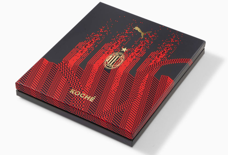 おそらくはオーセンティックモデルのみのと思われるが、ユニフォームは同じピクセル柄のボックスに収納。カバーにはPuma、ミラン、Kochéのロゴを配した特別デザインだ。