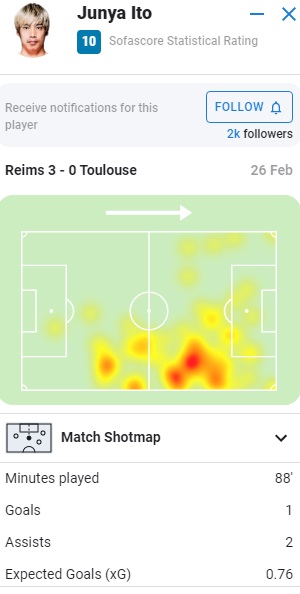 伊東は88分までプレーし、3-0の快勝に大貢献。『L'Équipe』は「伊東が教訓を与える」として8点の高評価を与えていた。