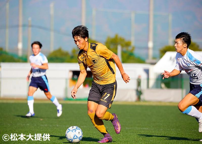 気持ちを切り替えるのに難儀したというが、それでもひた向きに努力を重ねた。大学3年次は全国の強豪校が競い合う総理大臣杯に出場し、デンソーチャレンジカップに北信越選抜として出場するなどコンスタントに結果を残した。そんな松本で飛ぶ鳥を落とす勢いで活躍する才能を、地元プロクラブが見逃すはずがなかった。