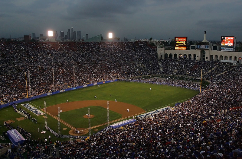 こちらは2008年3月29日に行われたドジャースのロサンゼルス移転50周年記念試合の様子。世界の野球史上最多となる11万5300人の観客を動員したとのことだが、フィールドの取り方が強引すぎる。さすがアメリカ!