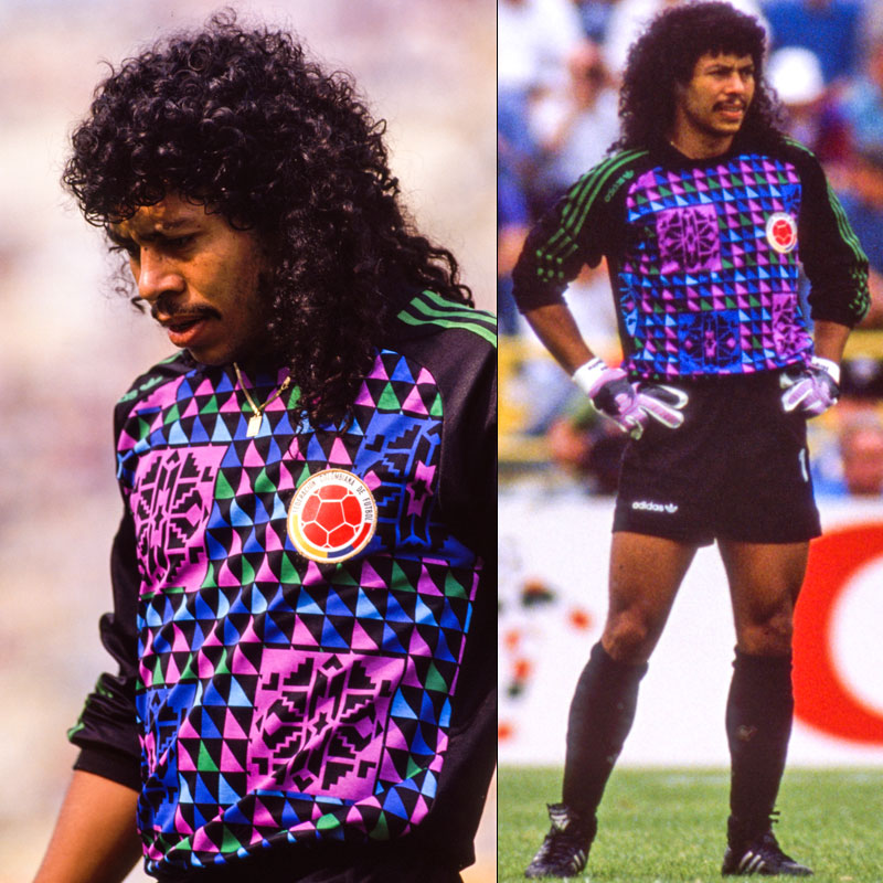 1990年イタリアW杯でコロンビア"最強GK”イギータが着たファンキーなユニフォーム。幾何学的なグラフィックの中に民族調の模様が顔をのぞかせる。凝視すると目が痛くなりそうなこのデザインは、ときに海外で最悪GKユニフォームに選ばれてしまうこともある。