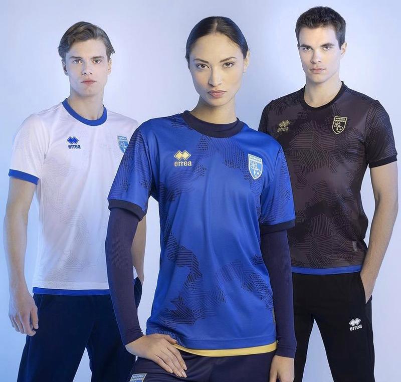 UEFAキットアシスタンス・スキームの一環で2023年からErreaのユニフォームを使用するコソボ。前面のグラフィックは国旗や国章に描かれているコソボの国土のシルエットだ。